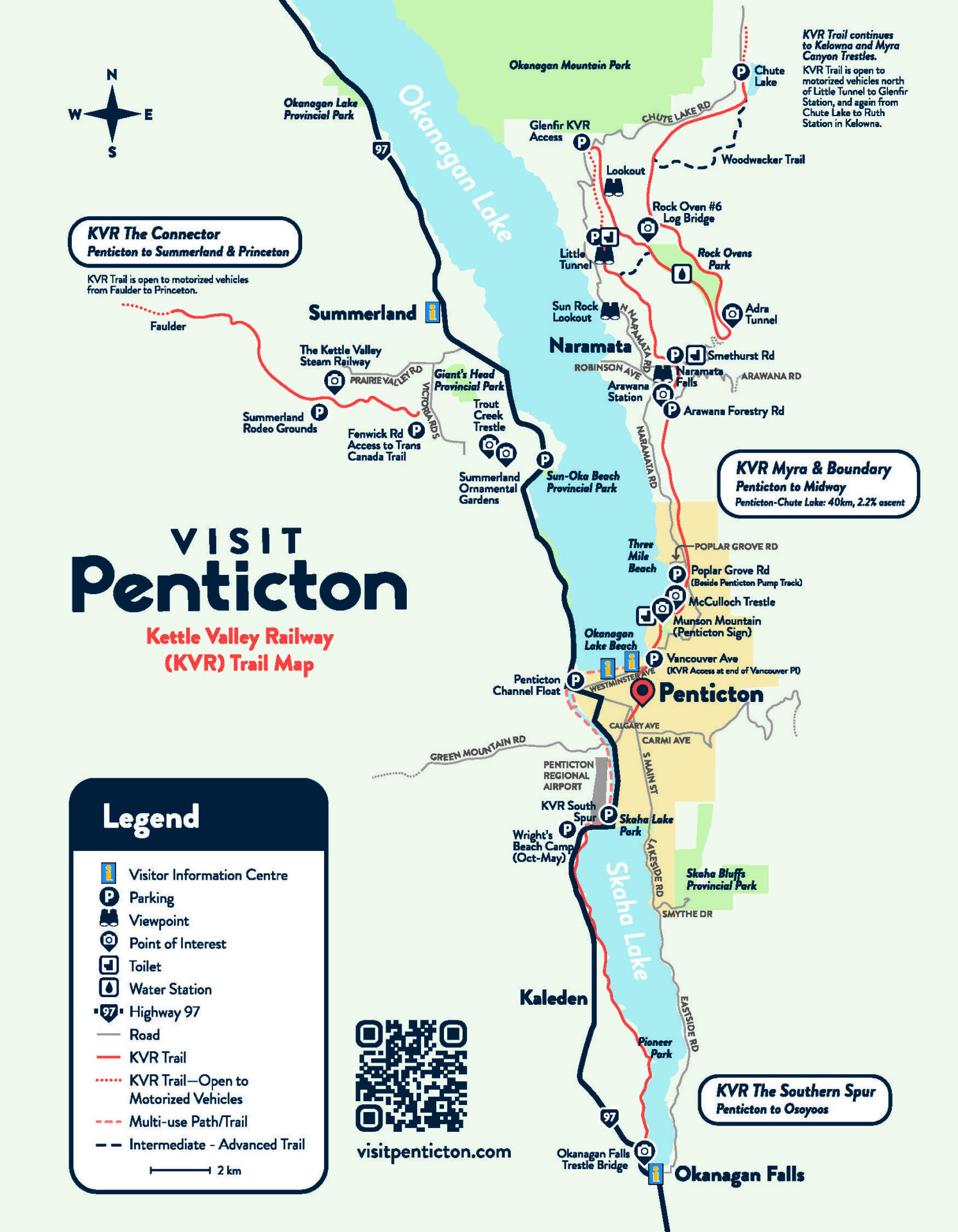 Please note, the Penticton Indian Band has temporarily closed a section of the former Kettle Valley Railway corridor owned by the band, which includes a portion of the South Spur KVR Trail, due to unsafe conditions caused by recent heavy rainfall.