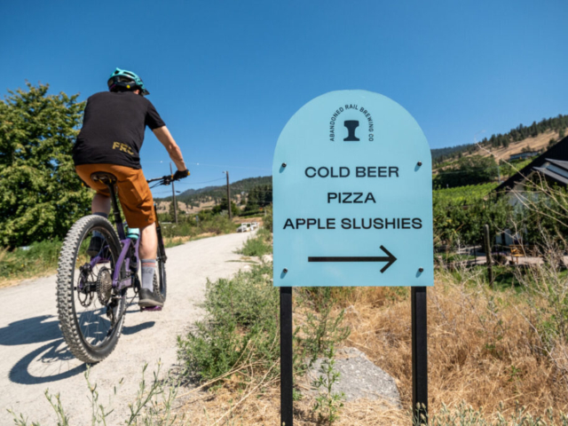 Not far from downtown Penticton, you’ll find a unique stop right along the trail — Abandoned Rail Brewing. With direct access from the KVR trail, this craft brewery is a perfect mid-ride refreshment break. Enjoy a crisp, small-batch beer on their patio, paired with a wood fired pizza if you’re hungry! For those non-beer drinkers, they also offer a variety of local wine, ciders, and some great non-alcoholic options including their famous apple slushies! From Penticton, you can reach the brewery by bike in about 20 minutes.