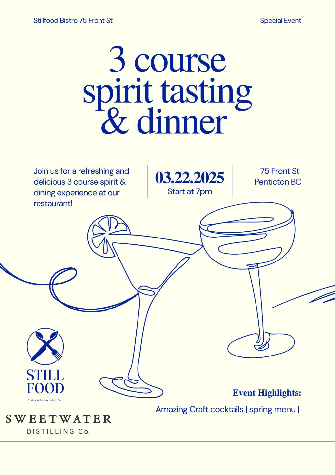 Indulge in an exclusive evening of culinary artistry and craft spirits at Stillfood Bistro! Join us for a 3-course dinner paired with premium spirit tastings, curated in collaboration with Sweetwater Distilling Co. Savor inventive dishes from our seasonal spring menu, expertly complemented with tasty spirits.