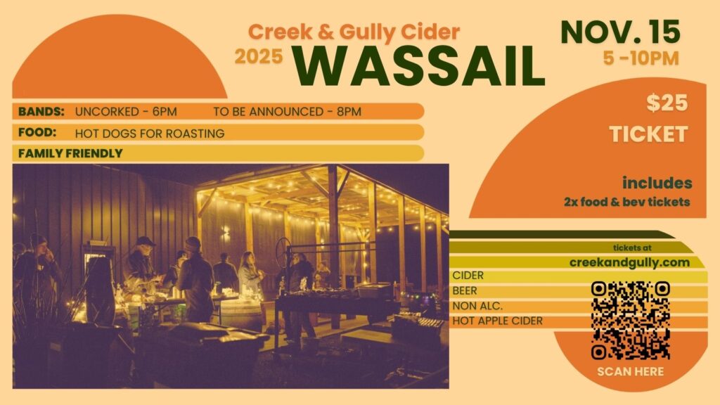 Creek & Gully Cider is proud to host its Annual Wassail Celebration, an outdoor evening of warmth, music, and community spirit inspired by old orchard traditions. The family-friendly festival welcomes guests to gather around bonfires, dance beneath the autumn sky, and raise a mug of house-made hot apple cider in gratitude for the year’s harvest.