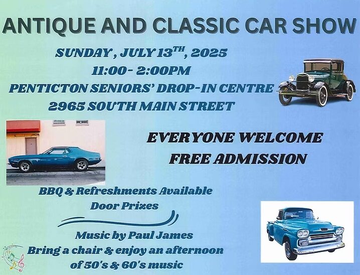 Come down and enjoy Antique cars and a BBQ with live music at the Penticton Seniors Centre.
