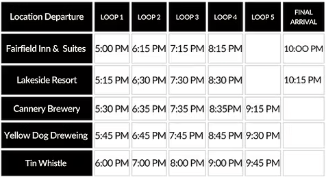 - Pick-up/Drop-off Locations: Fairfield Inn & Suites, Lakeside Resort, Cannery Brewing, Yellow Dog Brewing, Tin Whistle Brewing