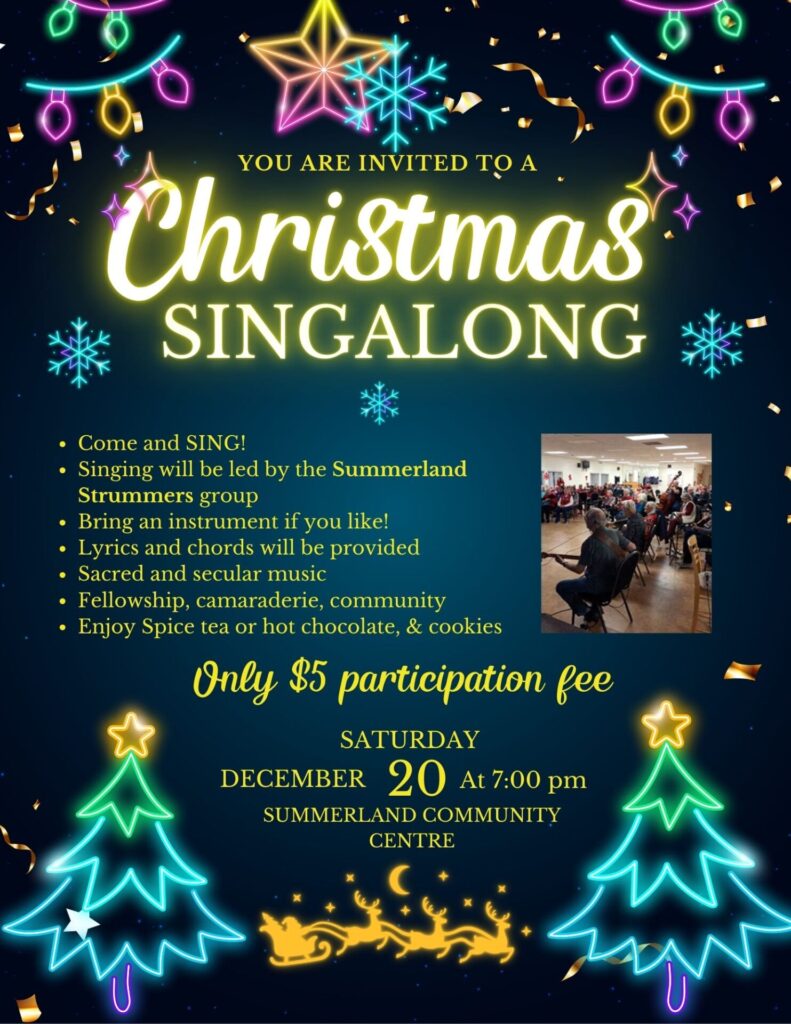 Come and join the Summerland Strummers for a warm and welcoming Christmas Singalong at the Summerland Community Center on Saturday, December 20 from 7:00 pm to 8:30 pm. Come raise your voice in a joyful mix of sacred and secular holiday favourites. Bring an instrument if you like. Lyrics and chords will be provided. Enjoy spiced tea, hot chocolate, and cookies, and celebrate the season with community and camaraderie. Admission is just $5 to cover refreshments.