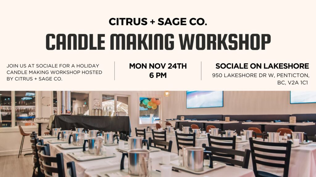 Join us for a cozy, hands-on candle-making experience at Socialē on Lakeshore, led by the talented artisans from Citrus + Sage Co.