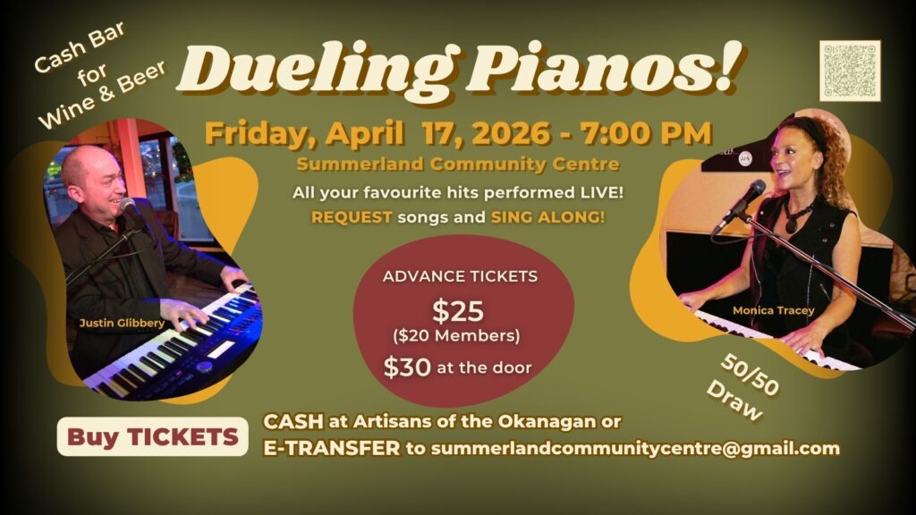 Dueling Pianos with Monica Tracey and Justin Glibbery is coming to the Summerland Community Centre. Enjoy an interactive night of music, laughter, and sing-along hits from the 60s to today.