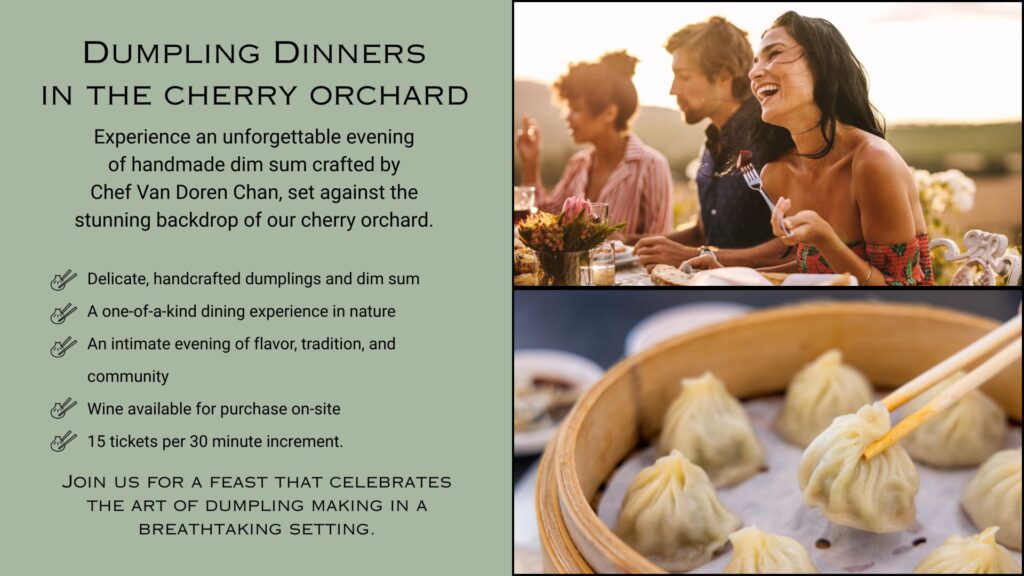 Chef Van Doren Chan brings her handmade Dim Sum to the Cherry Orchard at Lakeboat Vineyard & Winery! Tickets are just $39 per person.