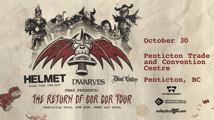 Legendary shock rockers GWAR have announced The Return of Gor Gor Tour, a devastating North American headline campaign with a stop on October 30th at The Penticton Trade and Convention Centre. Joining them on tour are Helmet, The Dwarves, and Blood Vulture. The tour celebrates GWAR’s 40th anniversary and the return of their long-lost, Dinosaur, Gor Gor. The tour also supports your Lords and Masters’ forthcoming multimedia release ‘The Return of Gor Gor,’ out July 25th via Pit Records/Z2 Comics.