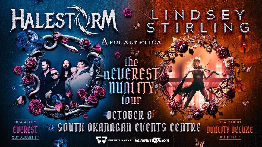 Penticton, BC | The South Okanagan Events Centre is thrilled to announce that the groundbreaking nEverest Duality Tour featuring rock powerhouse Halestorm, virtuoso violinist Lindsey Stirling, and Finnish cello metal pioneers Apocalyptica will be making a stop in Penticton on October 8, 2025.
