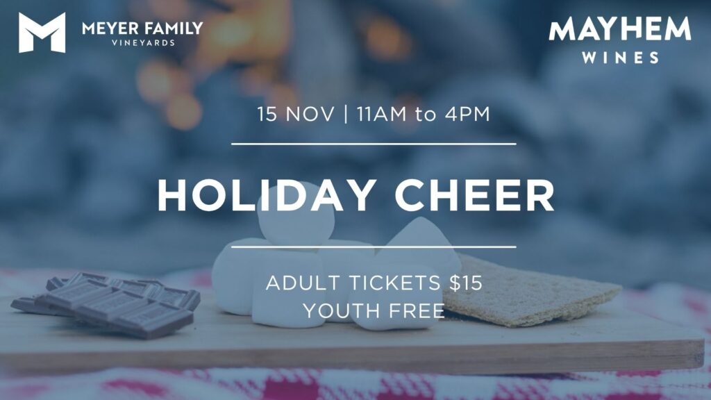 Join us on November 15 from 11AM to 4PM for a cozy afternoon at Meyer Family Vineyards & Mayhem Wines as we celebrate the season with great wine, warm treats, and live music featuring local artist Yanti (from 12pm to 3pm).