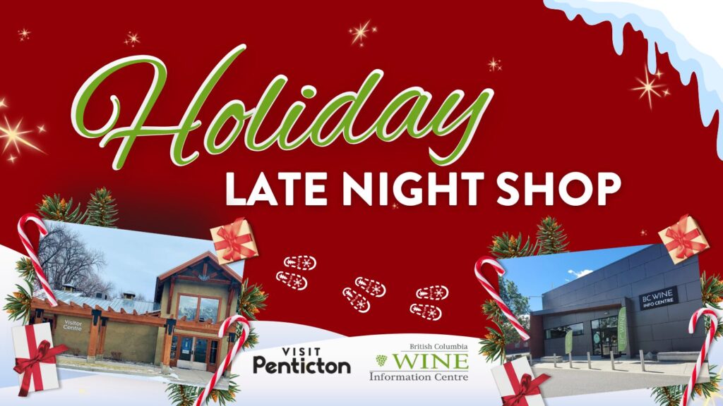 Celebrate the season with three evenings of shopping, sipping, and local cheer! Visit both the Penticton Visitor Centre and the Wine Info Centre for festive fun, great deals, and a chance to win a different door prize each week just by stopping in at both locations!