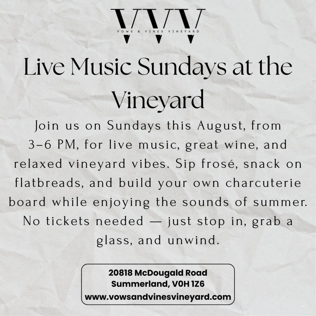 Join us Sundays from 3–6 PM, for live music, great wine, and relaxed vineyard vibes.
