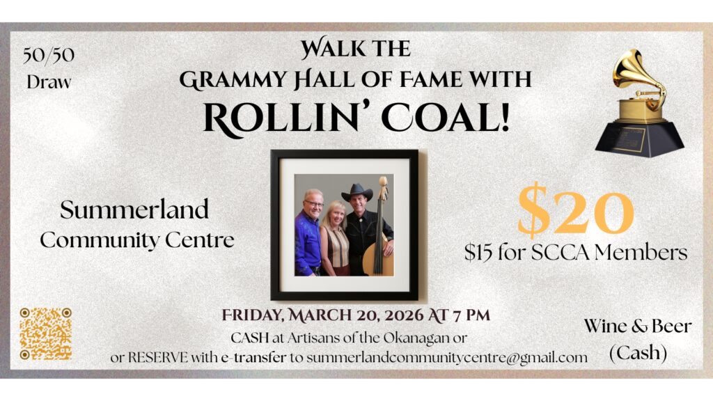 The Summerland Community Centre is thrilled to welcome Okanagan favourites Rollin’ Coal on Friday, March 20, 2026, at 7PM!