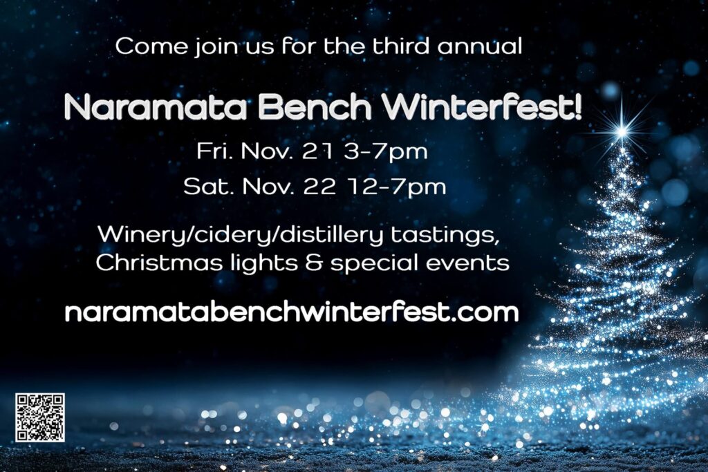 Experience the seasonal beauty of Naramata Bench Winterfest on Nov. 21st 3-7pm and Nov. 22nd from 12-7pm. Join us for exclusive winery, cidery, distillery and brewery tastings set against a backdrop of dazzling Christmas lights and decorations. Enjoy special events and unique holiday shopping. Warm up by the fire pits, savour seasonal cuisine, and create unforgettable memories in one of British Columbia’s most scenic wine regions. No tickets or reservations required. So, keep the date and kick off the holiday season with us!