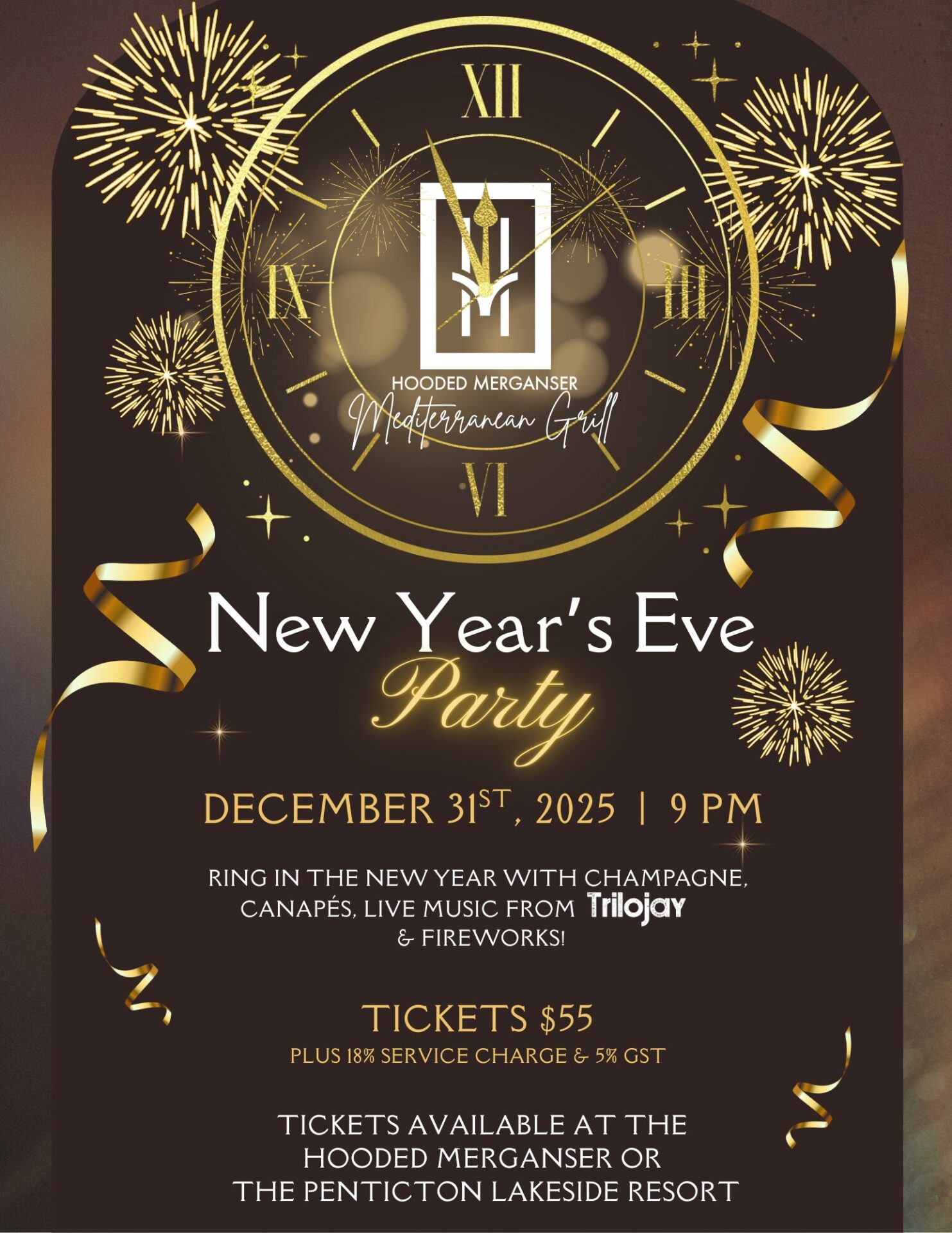 Ring in the New Year at the Hooded Merganser! Join us December 31st, 2025 for Champaign, canapes, live music from Trilojay & a front row seat to the Fireworks at Midnight!