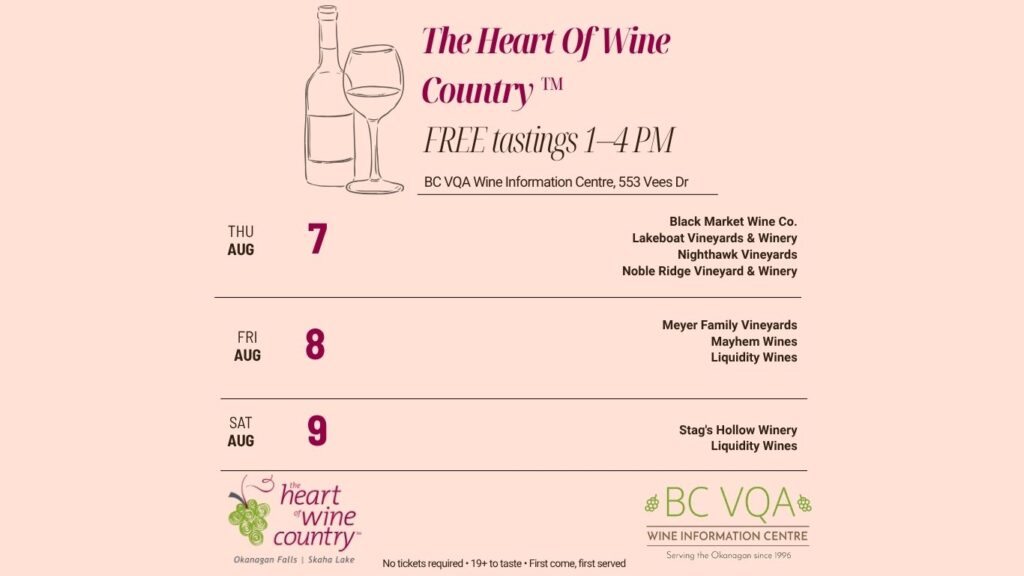 Join us August 7–9 at the BC VQA Wine Information Centre for FREE wine tastings featuring your favourite Heart of Wine Country wineries!