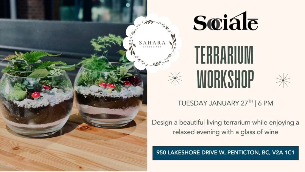 Create your own living terrarium with Sahara Garden Art. All materials and a glass of wine included. January 27 at Socialē, 6:00 PM.