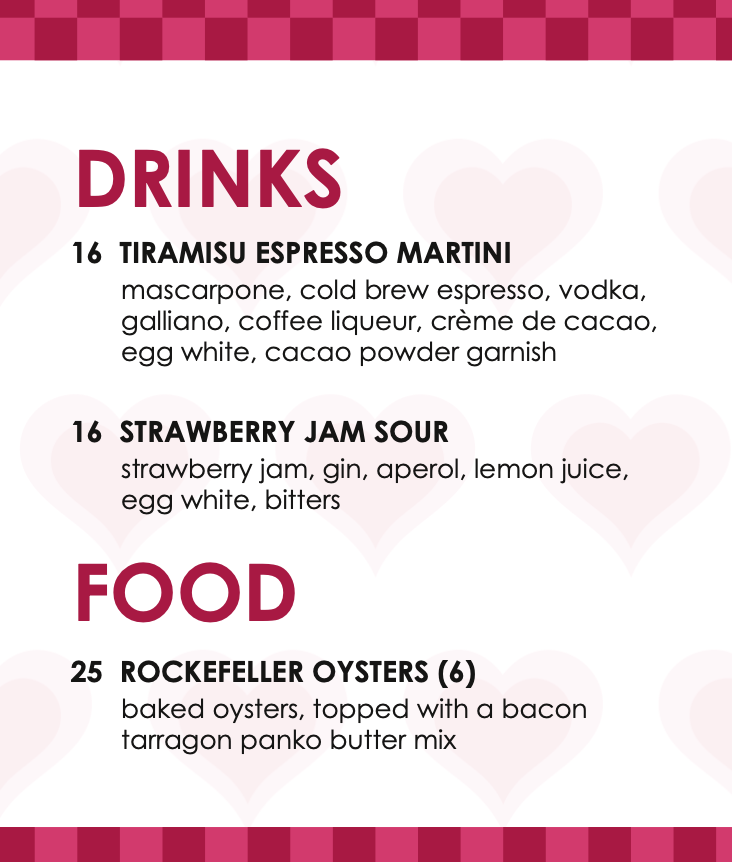 February 14, 2026 | $79.97/couple | VIEW MENU HERE