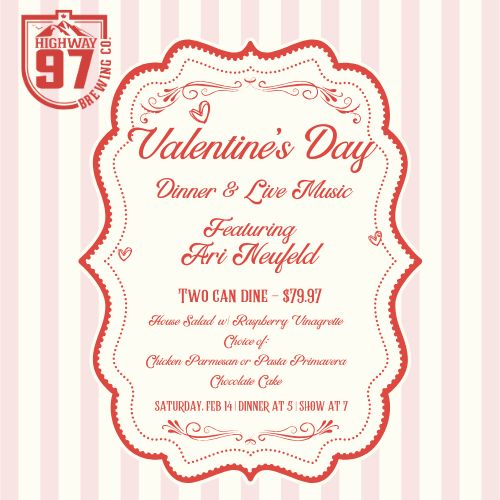 Celebrate Valentine’s Day with an easy, cozy night out at Highway 97 Brewery. Join us for our Two-Can-Dine Valentine’s Dinner – a curated dinner for two, paired with live music by Ari Neufeld and great beer. Dinner bookings available 5-7PM. Music starts at 7PM.