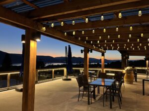 The bistro features a striking 65 seat dining area, lower outdoor patio and an upper open-air patio with breathtaking views of Okanagan Lake.