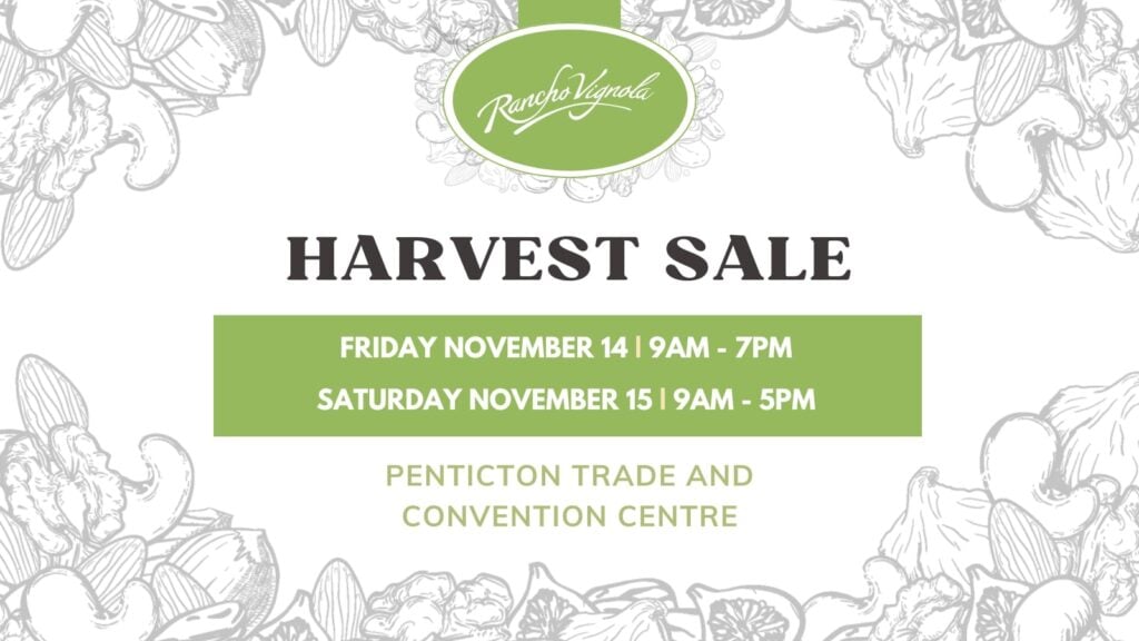 The Rancho Vignola Harvest Sale is coming to the Penticton Trade & Convention Centre on November 14-15th! You’ll find a bountiful selection of New Crop Nuts, Dried Fruits, Seeds, and more, all available to sample and purchase. Plus, explore our delicious Gourmet Gifts—perfect for the upcoming holiday season!