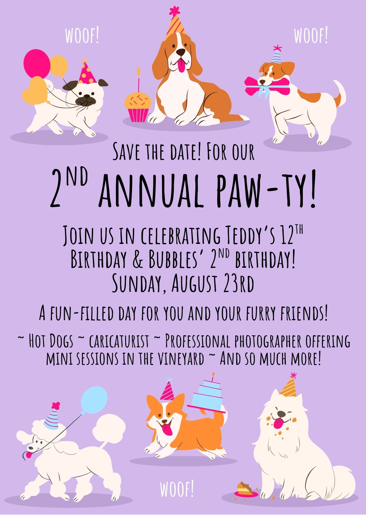 Come join us for our 2nd annual Pawty, in celebration of Teddy’s 12th Birthday & Bubbles’ 2nd Birthday! A fun-filled day for you and your furry friends!