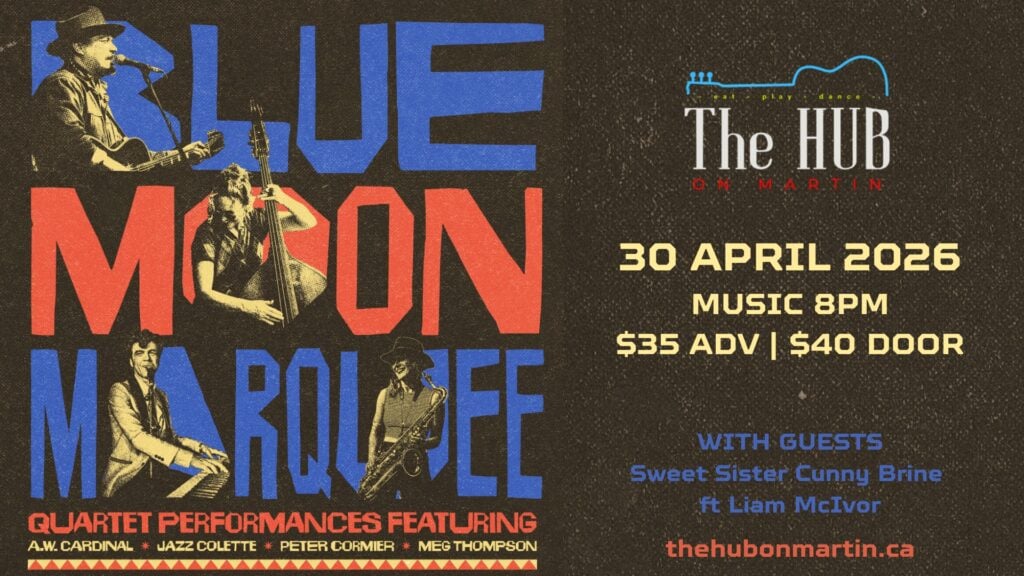 Winners of the 2024 JUNO Award for Blues Album of the Year, Blue Moon Marquee writes and performs original compositions influenced by anything that swings, jumps or grooves. Core members A.W. Cardinal (vocals/guitar) and Jasmine Colette a.k.a. Badlands Jass (vocals/bass/drums) have played for a vast gamut of crowds at jazz clubs, lindy hop dance halls, folk venues, blues haunts, hospitals, prisons, markets, motorcycle joints, dive bars and prestigious festival stages.